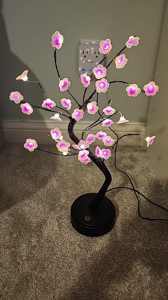 Bring a soft, elegant glow to your space with this artificial cherry blossom bonsai tree night light. Designed as a decorative tabletop lamp, it features delicate pink blossoms illuminated by warm white LED lights, creating a calming and cozy atmosphere for bedrooms, living rooms, offices, or desks.